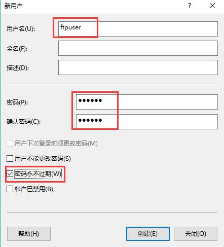 2. 輸入用戶名,自己隨便取,比如ftpuser,接著輸入密碼及確認(rèn)密碼,去掉“用戶下次登錄時(shí)須更改密碼”的勾,選擇“密碼永不過期”,創(chuàng)建。