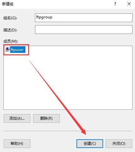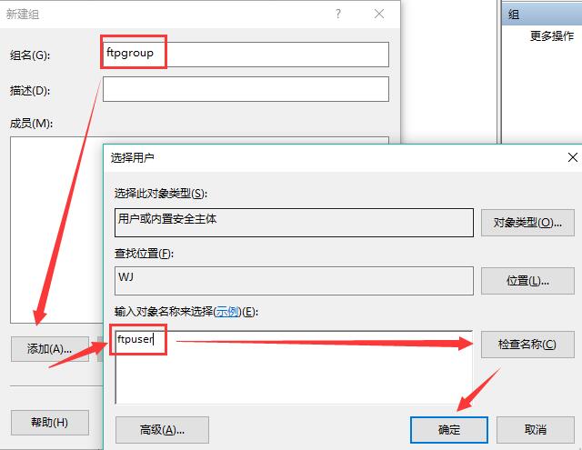 4. 取個(gè)組名,比如ftpgroup,之后選添加成員,把之前創(chuàng)建的ftpuser添加進(jìn)來,選檢查名稱,之后確定。