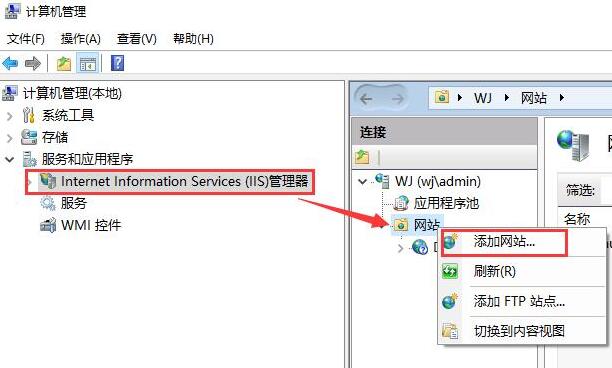 1. 右鍵我的電腦,管理→服務(wù)和應(yīng)用程序→IIS管理器,進(jìn)入IIS設(shè)置,右鍵點(diǎn)擊網(wǎng)站→添加網(wǎng)站