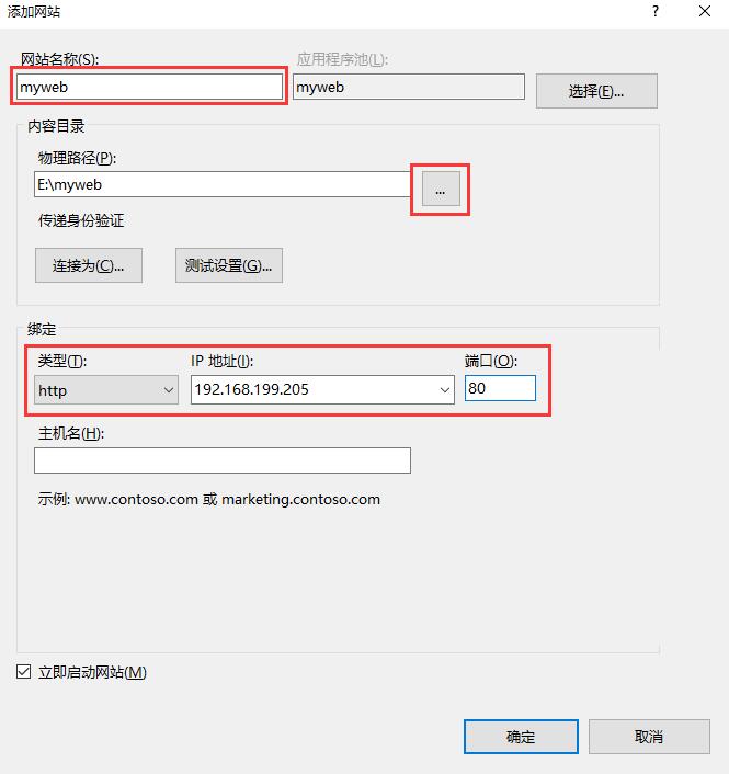 2. 給網(wǎng)站起個(gè)名字,比如myweb,選擇物理路徑(你需要存放資源的文件夾),綁定類型默認(rèn)為http,在IP地址欄點(diǎn)擊下拉框后,系統(tǒng)會給出一個(gè)IP地址,選擇即可(每個(gè)人IP都不一樣,我的由于是本機(jī),所以IP地址為局域網(wǎng)192段),http端口默認(rèn)80,主機(jī)名就是域名,比如www.abc.com,如有則填上,否則不填,最后點(diǎn)確定。