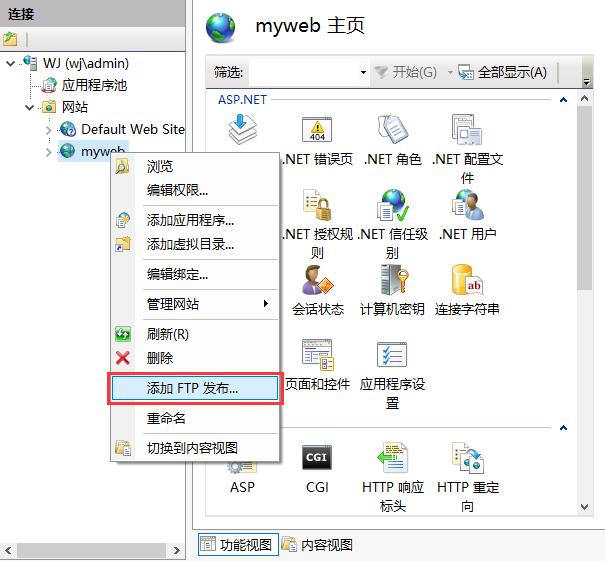 3. 右鍵點(diǎn)擊剛建立的網(wǎng)站myweb,選擇“添加FTP發(fā)布...”