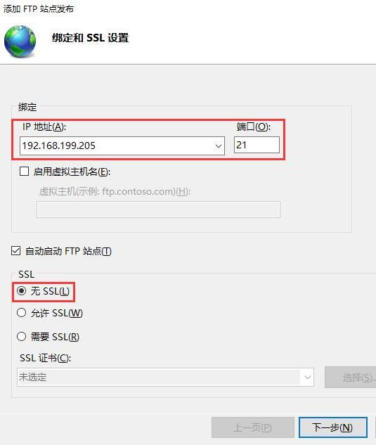 4. 同樣,點(diǎn)擊下拉框,選擇剛才選中的IP地址,端口默認(rèn)21,虛擬主機(jī)名即ftp的域名,比如ftp.abc.com,如有則填上,否則不填,SSL選擇無SSL,之后點(diǎn)下一步。