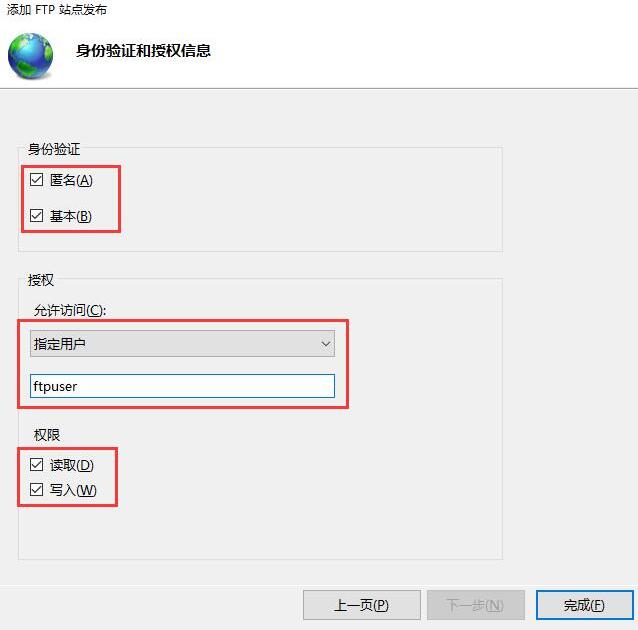 5. 身份驗(yàn)證勾選 “匿名和基本”,允許訪問選擇“指定用戶”,框內(nèi)填第一步所建立的用戶名ftpuser,權(quán)限選擇“讀取寫入”,完成。